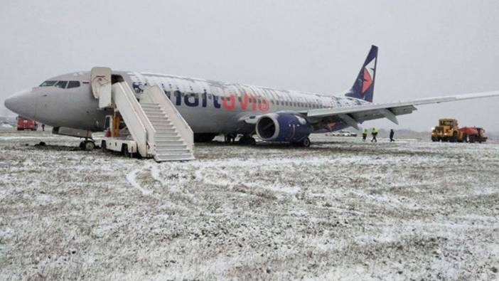 Rusya’daki Perm Bolshoye Savino Havalimanı’nın karlı pistine iniş yapan Smartavia Hava Yollarına ait Boeing 737-800 tipi uçak pistten çıkarak büyük tehlike atlattı.