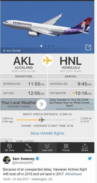 Hawaiian Havayoları’na ait 446 numaralı uçuş, Auckland Havaalanı’ndan 1 Ocak 2018’de yerel saatle 00:05’te kalktı ve Honolulu’ya 31 Aralık 2017’de 10:16’da vardı. Auckland, Honolulu’nun 23 saat ilerisinde. Twitter paylaşımının altına ilginç yorumlar da yapıldı. Bir Twitter kullanıcısı “Yani, zaman içinde yolculuk yapabiliyoruz, ama hâlâ uçan arabalarımız yok” dedi. Bir başka kullanıcı ise, “Yani teoride yolcular yeni yılı kutlayıp, 24 saat içinde ikinci kez kutlama şansı yakalayacaklar” dedi.
