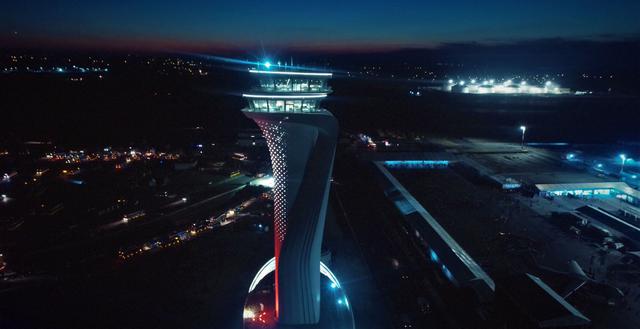 Tamamlandığında dünyanın en büyüğü olacak İstanbul 3. Havalimanı’nın ’Lale’ figüründen esinlenerek yapılan ’Hava Trafik Kontrol Kulesi’nin gün batımında ışıl ışıl görüntüsü havadan görüntülendi. 90 metre yüksekliğindeki Hava Trafik Kontrol Kulesi’nde lale figürünün silueti kırmızı ve beyaz renkli ışıklar ile aydınlatıldı.