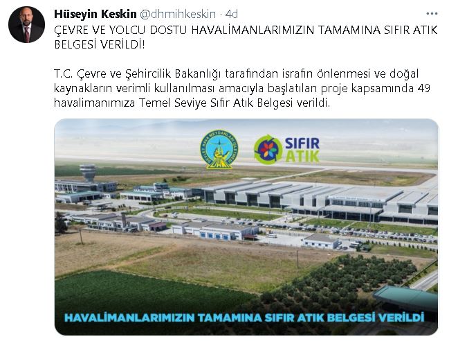 Çevre ve Şehircilik Bakanlığı tarafından israfın önlenmesi ve doğal kaynakların verimli kullanılması amacıyla başlatılan ve sonrasında mevzuat haline getirilen Sıfır Atık Projesi kapsamında DHMİ tarafından işletilen tüm havalimanları Temel Seviye Sıfır Atık Belgesi aldı.