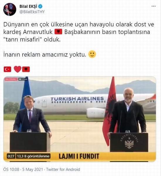 THY Genel müdürü Bilal ekşi de sosyal medya hesabından ”Dünyanın en çok ülkesine uçan havayolu olarak dost ve kardeş Arnavutluk Başbakanının basın toplantısına ‘tanrı misafiri’ olduk. İnanın reklam amacımız yoktu” ifadelerini kullandı.