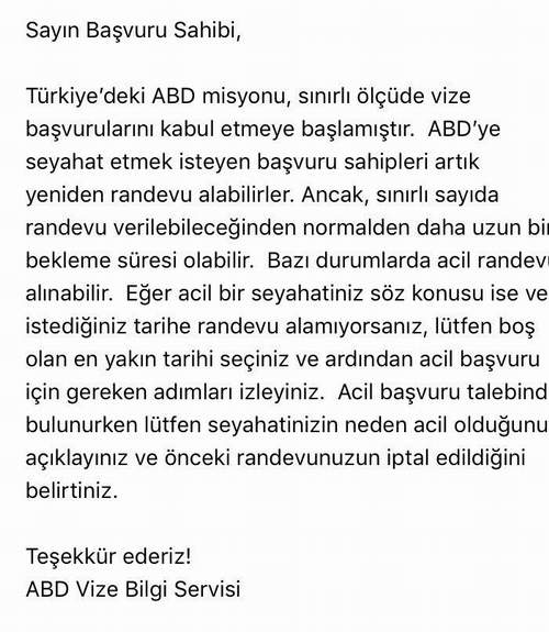 Bazı vize acentalarının müşterilerine gönderdiği mesajda da “ABD’ye seyahat etmek isteyen başvuru sahipleri artık yeniden randevu alabilirler. Ancak, sınırlı sayıda randevu verilebileceğinden normalden daha uzun bir bekleme süresi olabilir” ifadeleri yer aldı.