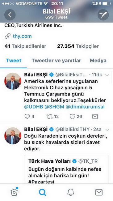 Konuyla ilgili resmi twiter hesabından açıklama yapan Türk Hava Yolları Genel Müdürü Bilal Ekşi, “Amerika seferlerine uygulanan Elektronik Cihaz yasağının 5 Temmuz Çarşamba günü kalkmasını bekliyoruz.Teşekkürler @UDHB<https://twitter.com/UDHB> @SHGM<https://twitter.com/SHGM> @dhmikurumsal<https://twitter.com/dhmikurumsal> diye bir twitt atarak duyurdu.