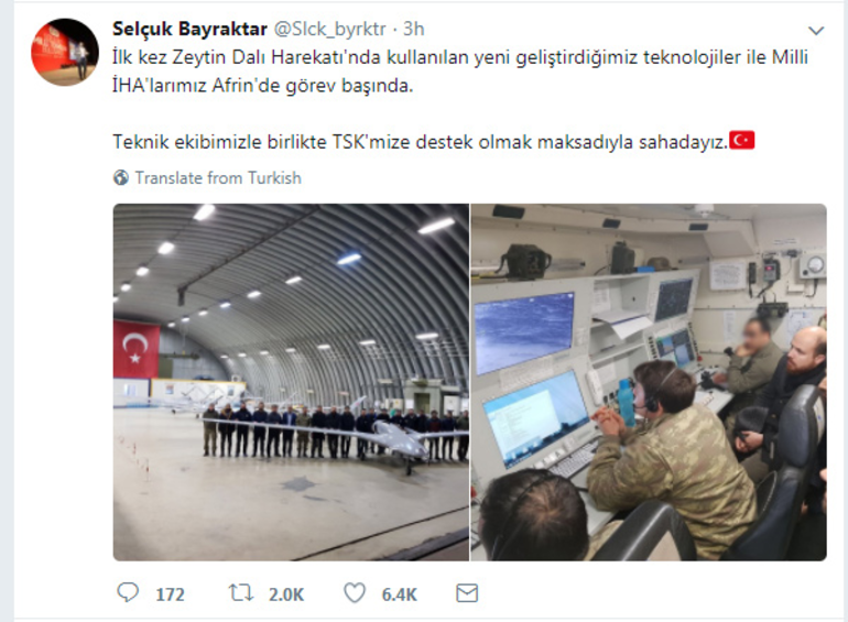 Bayraktar, attığı tweette paylaştığı fotoğrafla birlikte “İlk kez Zeytin Dalı Harekatı’nda kullanılan yeni geliştirdiğimiz teknolojiler ile Milli İHA’larımız Afrin’de görev başında. Teknik ekibimizle birlikte TSK’mize destek olmak maksadıyla sahadayız.” ifadelerini kullandı.