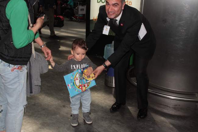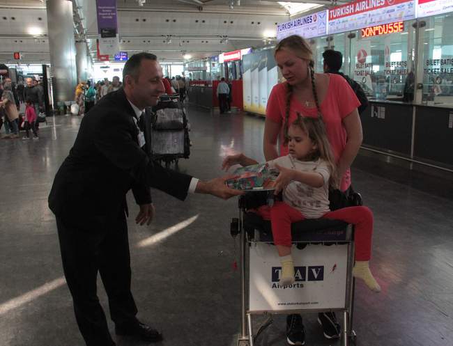 TAV görevlileri, İstanbul Atatürk Havalimanı Dış Hat Gidiş Terminali’ndeki güvenlik noktalarından giriş yapan yolculara, boya kalemleri ve yapbozdan oluşan hediye paketi dağıttı.