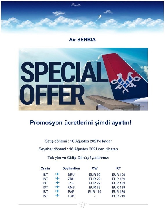 Air Serbia, 16 Ağustostan itibaren gerçekleştireceği uçuşlarda Avrupa’nın birçok kentine avantajlı fiyatlarla bilet satışı gerçekleştireceğini duyurdu.