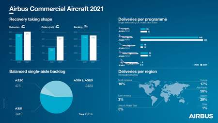 2021’de Airbus, tüm programlarda ve pazar segmentlerinde brüt 771, net 507 adet sipariş ile 2020’ye kıyasla brüt sipariş alımını ikiye katladı. Bu siparişler, şirketin tüm ürün yelpazesinin gücünün ve yenilenen pazar güveninin önemli bir göstergesidir.