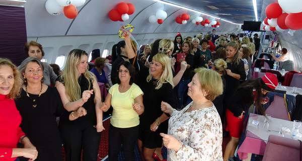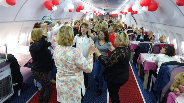 Uçakta kadınlar matinesi düzenleyen işletmeciler, ilgiden oldukça memnun. Yolcu uçağında eğlenmenin çok farklı bir duygu olduğunu söyleyen kadınlar ise canlı müzik eşliğinde halay çekip doyasıya bir eğlence yaşadı.