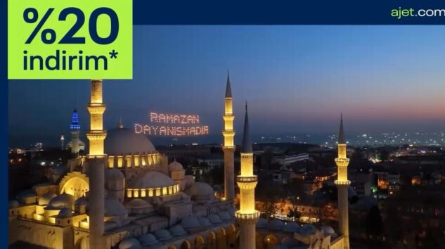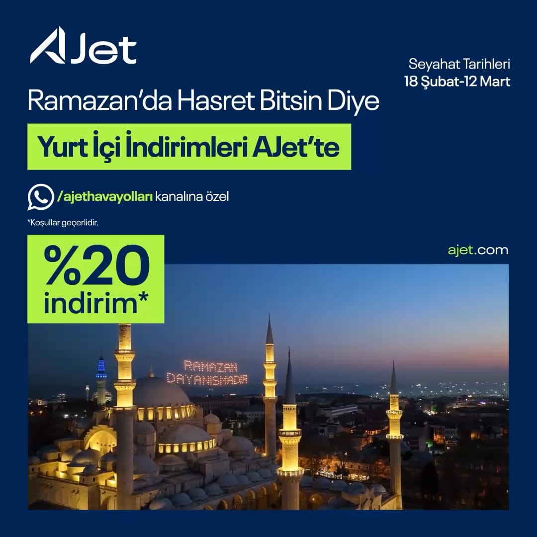 AJet, Ramazan ayına özel kampanyasıyla tüm yurt içi uçuşlarda geçerli yüzde 20 indirim fırsatı sunuyor. 11–12 Şubat’ta alınacak biletlerle yolcular, 18 Şubat–12 Mart tarihleri arasında avantajlı fiyatlarla seyahat edebilecek.