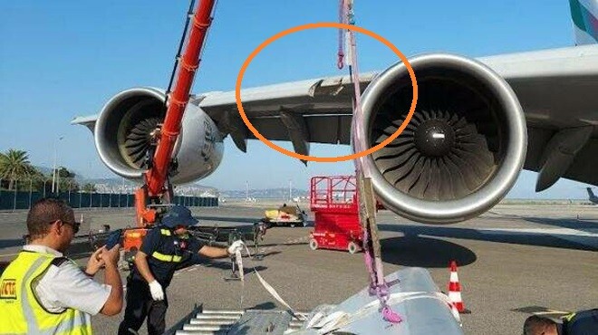 “18 Ağustos günü Emirates’in, Dubai’den Nice’e giden EK 77 sefer sayılı uçağın normal bir şekilde indi, yolcular ile mürettebat güvenli bir şekilde uçağı terketti. İnişin ardından mühendisler, sağ kanattaki bir çıtada bir miktar hasar tespit etti ve uçak bakıma alındı.”