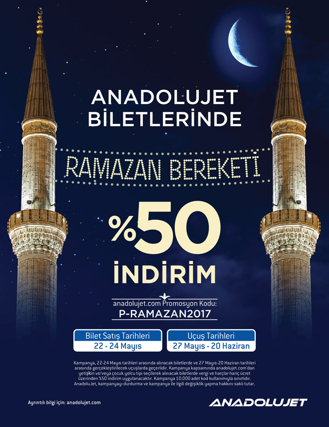 AnadoluJet yolcuları Ramazan Ayı’na özel düzenlenen kampanyada 22-23-24 Mayıs 2017 tarihlerinde aldıkları biletler ile 27 Mayıs – 20 Haziran 2017 tarihleri arasında, diledikleri noktaya yüzde 50 indirimli fiyatlar ile seyahat edebilecek.