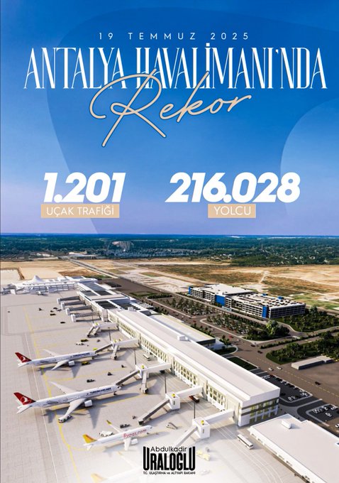 Ulaştırma ve Alyyapı Bakanı Abdülkadir uraloğlu sosyal medya hesabından yaptığı paylaşımda ”Antalya Havalimanı’ndan Yeni Rekor . 19 Temmuz 2025’te 216 bin 28 yolcu ve Bin 201 uçak trafiği ile