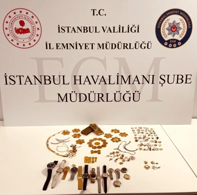 İstanbul Havalimanı’nda yapılan operasyonda, yabancı uyruklu kadın yolcunun üzerinden 3 kilo 117 gram külçe takoz altın, çeşitli markalara ait ortalama değeri 565 bin lirayı bulan 14 kol saati 352 bin lira değerinde yüzük, kolye ve küpeden oluşan ziynet eşyası ile tarihi eser niteliğinde sikkeler ele geçirildi. Kadın yolcunun, bedenine “göbek” görünümü vermesi için yerleştirilmiş çantadan çıkan kilolarca altın, kol saatleri ve sikkelere el konuldu.