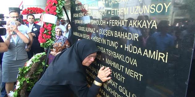 Dış Hatlar Terminali geliş katı önünde hayatını kaybedenlerin isimlerinin yazılı olduğu anıtın önünde saat 14.00’de gerçekleşen anmada, gözyaşları sel oldu. yapılan törene katılanlar gözyaşlarına hakim olamadı.