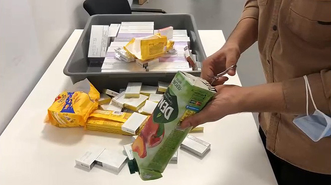 Şüphelinin üst araması ve çantasında yapılan incelemede meyve suyu şişesi, bisküvi ve çikolata paketlerine gizlenmiş farklı renklerde toplamda 60 karton (600 adet) elektronik sigara filtresi ele geçirildi.