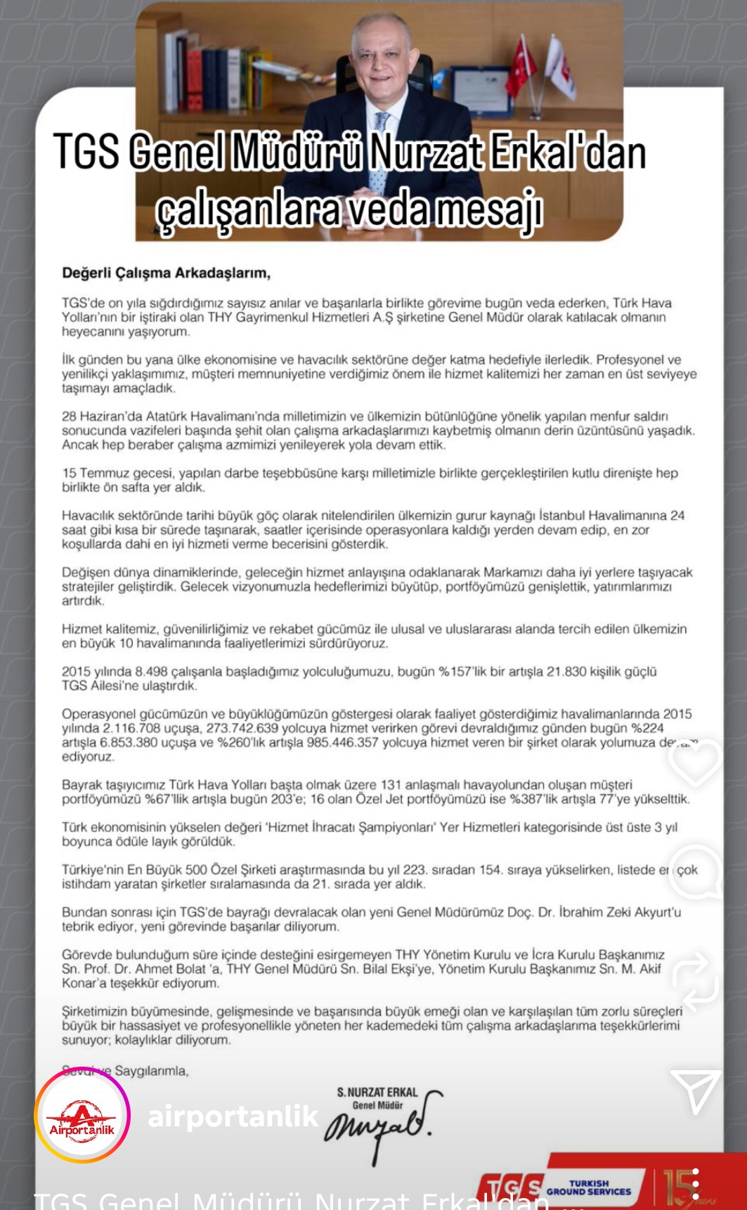 TGS Genel Müdürlük görevinden THY Gayrı Menkul AŞ’ye aranan Nurzat Erkal, çalışanla e mail yolu ile vedalaştı. İşte Nurzat Erkal’ın mesajı: