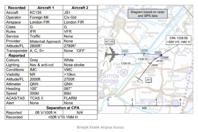 KC-135 tipi uçak, RAF Mildenhall’a iniş için alçalmaya başladığı sırada, Cambridgeshire bölgesindeki Chatteris Airfield yakınlarında bir planörle karşılaştı. Planör, KC-135’in hemen üzerinde uçuyordu ve iki hava aracı neredeyse birbirine temas edecek kadar yaklaştı. Airprox Kurulu, olayın “Kategori A” yani en yüksek risk seviyesinde olduğunu belirtti.
