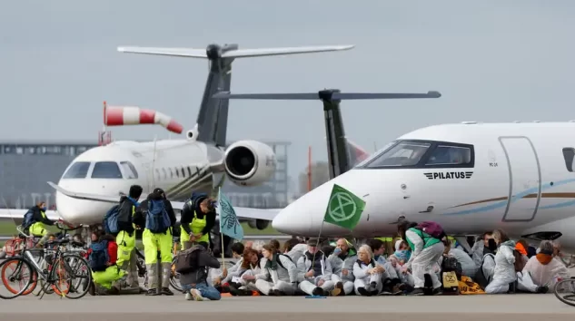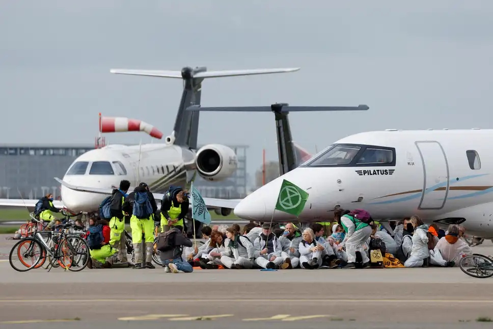 Hollanda’da çevreci gruplar, iklim değişikliğine dikkati çekmek amacıyla Amsterdam Schiphol Havalimanı’ndaki uçuş sayılarının azaltılması ve hava yoluyla daha az seyahat edilmesi için gösteri düzenledi.