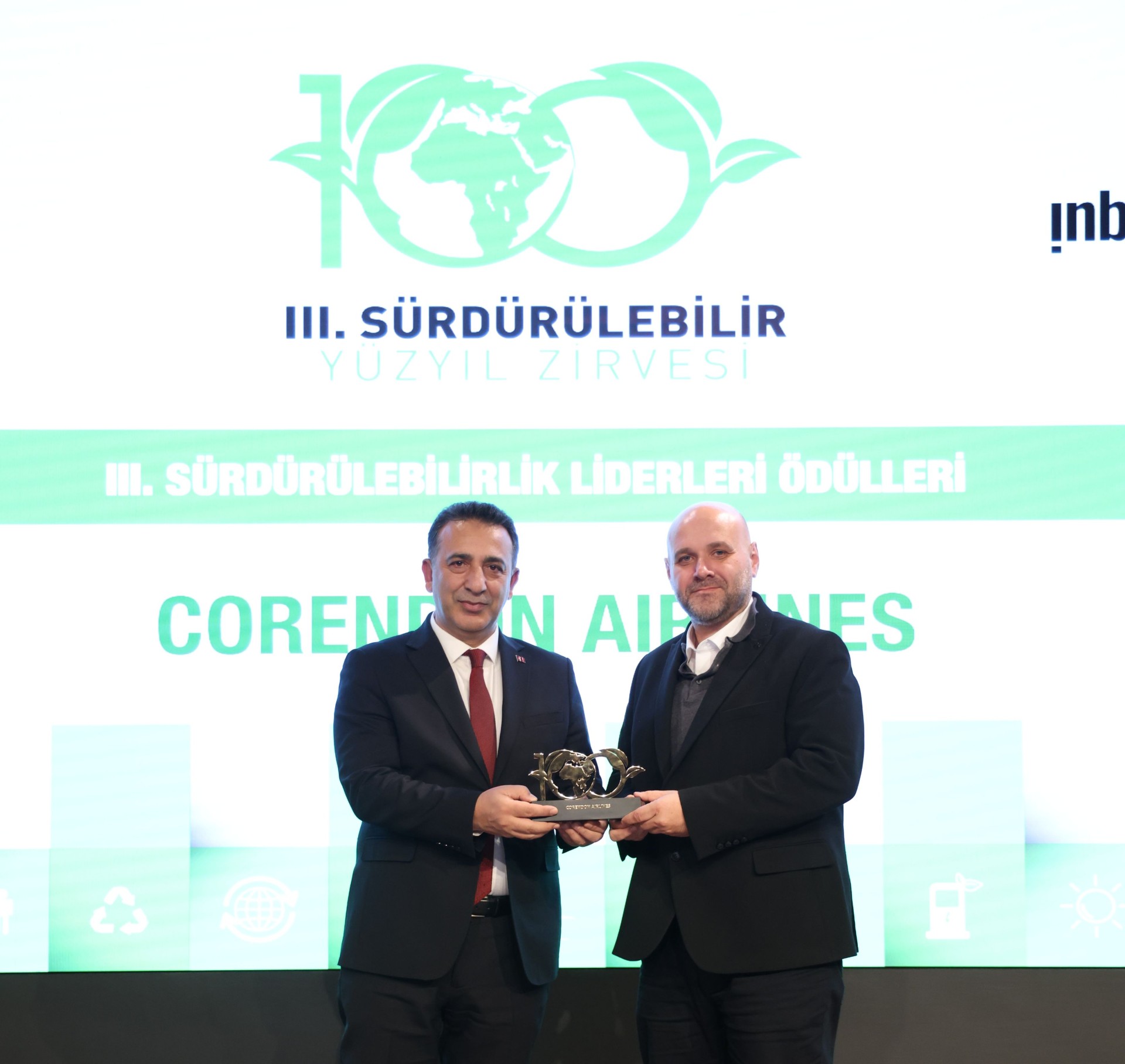 Turkuvaz Medya Grubu’nun aylık ekonomi yayını InBusiness Dergisi tarafından bu yıl üçüncüsü düzenlenen Sürdürülebilirlik Liderleri Ödülleri, 15 Aralık 2025 tarihinde Turkuvaz Medya Merkezi’nde gerçekleştirilen törenle sahiplerini buldu. İlklerin havayolu şirketi Corendon Airlines, sürdürülebilir ürün ve uygulamalarıyla ödül kazanan kurumlar arasında yer aldı. Çevre, Şehircilik ve İklim Değişikliği Bakanlığı ile InBusiness Dergisi editörlerinden oluşan jüri tarafından yapılan değerlendirme sonucunda; Corendon Airlines’ın Antalya Havalimanı’nda sürdürülebilir havacılık yakıtı (SAF) kullanımına başlaması, bu uygulamayı ölçeklendirme hedefi ve IATA Fly Net Zero 2050 taahhüdünü desteklemesi, ödüle gerekçe olarak gösterildi.