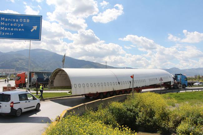 TIR’la taşınan uçağı görenler ilgiyle izledi. İzmir’in Çiğli ilçesindeki özel bir havacılık lisesinde, öğrencilerin uygulamalı eğitimi için kullanılmak üzere istanbul’dan yola çıkarılan 54 metrelik uçağın parçaları yüklü olan 3 TIR Manisa’ya ulaştı. TIR’ların, İstanbul – İzmir karayolunun Manisa girişindeki Gediz Köprülü Kavşağı yakınında, çevreyoluna dönüş için manevra yapması sırasında, polisler ve nakliyat şirketi elemanları zor anlar yaşadı.