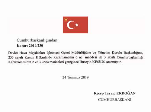 25 Temmuz 2019 tarihinde Resmi Gazete’de bazı kurumlara ilişkin atama kararları yayınlandı. Devlet Hava Meydanları İşletmesi (DHMİ) Genel Müdürlüğü ve Yönetim Kurulu Başkanlığına Hüseyin Keskin atandı.