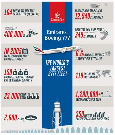 Boeing tarafından şu ana kadar üretilen her sekiz 777 uçağından biri, Emirates’e teslim edilmiş durumda. Emirates, ayrıca, Boeing 777-8 ve 777-9 adlı iki yeni nesil modeli uçuran ilk havayolu şirketlerinden birisi olacak.