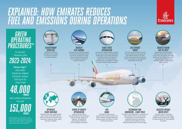 Gereksiz yakıt tüketimini ve emisyonları azaltmak için her Emirates uçuşu sırasında operasyonel olarak havada ve yerdeki mümkün olan her alanda alınan temel operasyonel önlemlerden bazıları şunlardır: