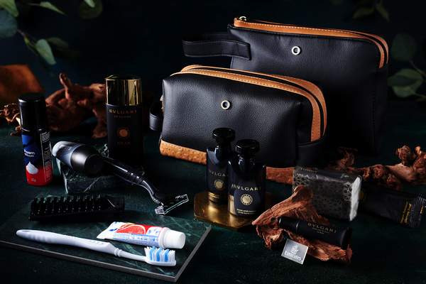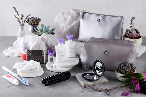 Emirates’in ayrıcalıklı bir uçuşla yolcularına konfor sunma taahhüdüne uygun olarak, güncel trendlerdeki renk ve tasarımları olan First ve Business Class seyahat kitlerinde, Emirates için özel olarak tasarlanmış şişelerde Bulgari kokuları bulunuyor. Yeni seri, First ve Business Class’ta klasik taba rengi ve siyah kumaş, leylaklı modern gümüş veya lila vurgulu abartısız siyah renklerde sekiz farklı koleksiyon çantası sunuyor.