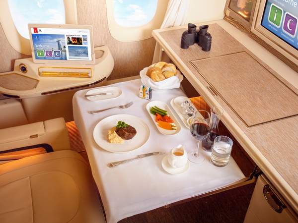 Gökyüzünde Sinema: First Class yolcuları, Emirates’in uçak içi eğlence sistemi ice üzerindeki 5000 kanalın keyfini çıkarırken sinema atıştırmalıkları sipariş ederek uçakta unutulmaz bir sinema anı yaratabilirler. Sinema atıştırmalıkları menüsü ıstakozlu sandviçler, iştah açıcı mini hamburgerler, edamame ve tuzlu patlamış mısır gibi klasikleri içermekte ve istek üzerine sipariş edilebilmektedir. Tüm yolcular ayrıca uçuş öncesi Emirates uygulamasındaki film ve dizilere göz atarak ve seçimlerini önceden yaparak kendi ice deneyimlerini oluşturabilir ve uçağa bindiklerinde seçimlerini ice sistemine senkronize ederek kolaylıkla seyahat deneyimini en üst düzeye çıkarabilirler.