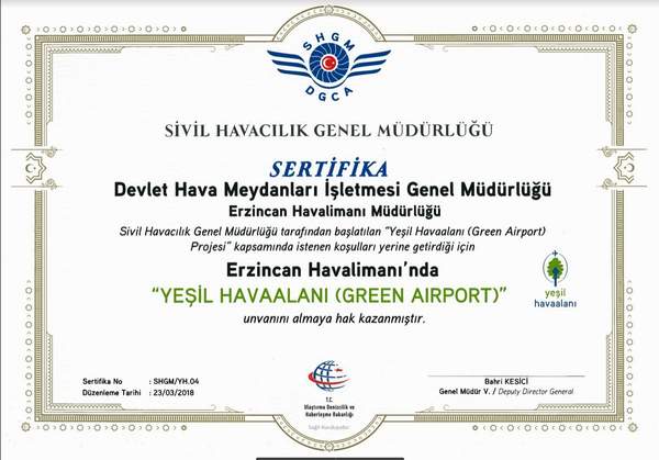 Bu kapsamda Erzincan Havalimanımıza da 23 Mart 2018 tarihinde “Yeşil Havaalanı (Green Airport)” unvanı verildi. Böylece Adana, Tokat ve Uşak Havalimanlarının ardından Yeşil Havaalanı sayımız 4’e çıktı. “Yeşil Kuruluş” sertifikalı havalimanı saysı ise 43’e yükdeldi.