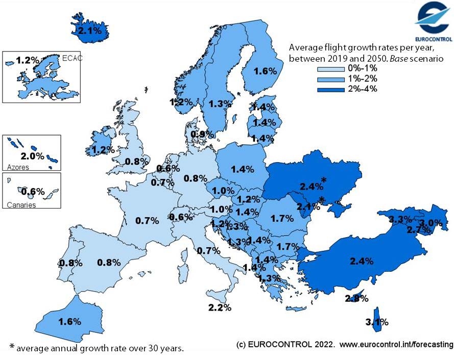 EUROCONTROL’ün  30 Yıllık Havacılık Görünümü Raporu’na göre önümüzdeki 30 yılda Türkiye’deki ortalama trafik artışının yüzde 2,4 olacağı öngörüldü.