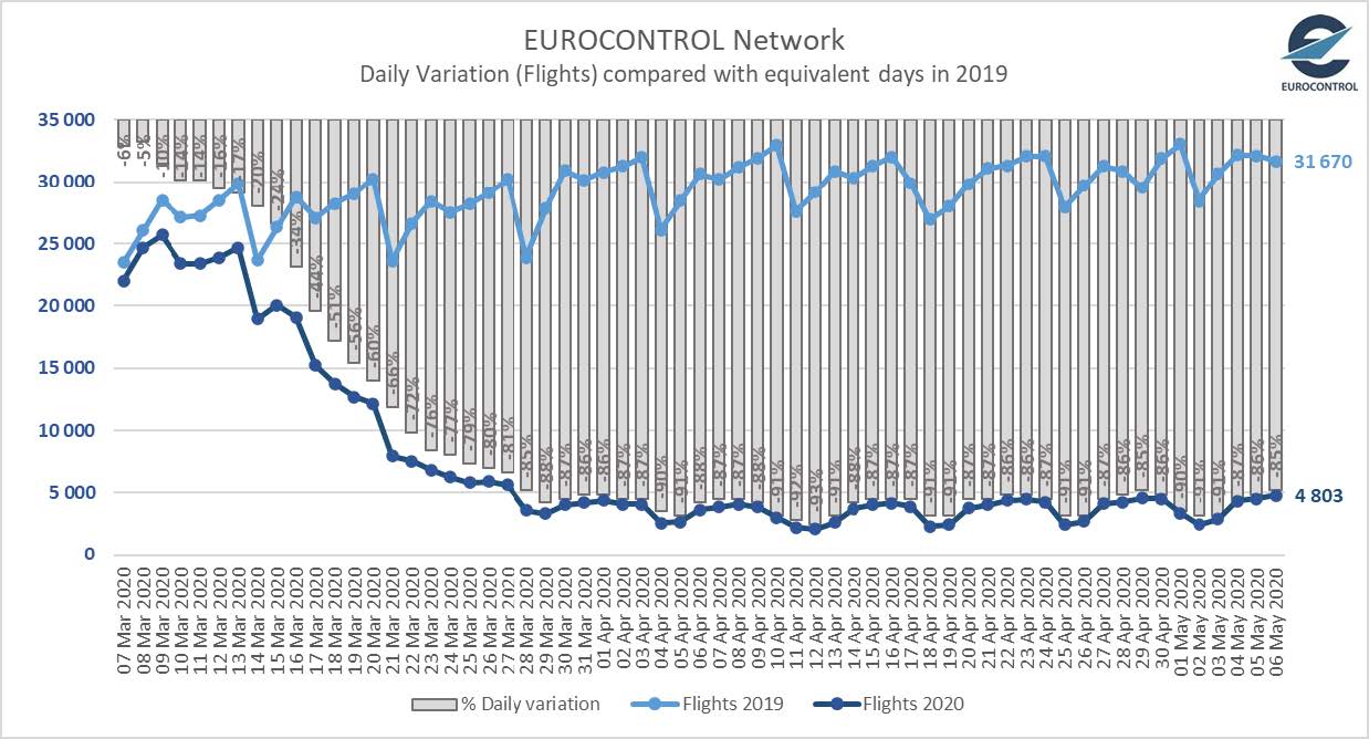 Havalimanlarında günlük uçuş trafiği rakamlarına göre ise geçen yıla göre yüzde 80 oranında daha az uçuş gerçekleştirildi. 6 Mayıs tarihinde Paris Orly Havalimanı’nda uçuşu yokken Londra Gatwick% -99, Münih -94%, Viyana -94%, Madrid -93%, Dublin -91%, İstanbul -88%, Amsterdam -87%, Paris CDG -86%, Milan Malpensa -84%, Londra Heathrow -84%, Atina -83 %, Frankfurt% -83 ve Oslo -78% düşüş yaşandı. 06 Mayıs Çarşamba günü Frankfurt, 258 hareketle en işlek havalimanıydı, onu Londra / Heathrow (217), Amsterdam (200), Paris CDG (194), Leipzig (190), Oslo Gardermoen (187), Köln / Bonn ( 166), Bergen (161), İstanbul (147) ve Liege (123) takip etti.