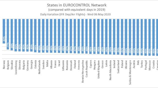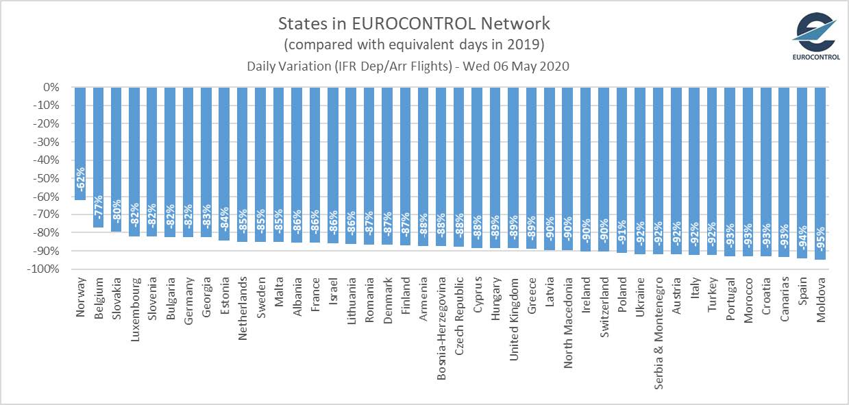 Havayollarında ise Avrupa’nın en büyük Hava Operatörleri 6 Mayıs Çarşamba günü yapılan uçuşlara göre, EasyJet -99.2%, Ryanair Grubu -98.2%, IAG Havayolları -95.9%, Lufthansa Grubu -94.7% ve Air-France-KLM -93,2%. düşüş yaşandı. Pegasus, Brussels Airlines, Avusturya Havayollarının hiç operasyon yapmadığı 6 Mayıs tarihli uçuşlara göre, Air France -95%, British Airways ve Lufthansa -94% , KLM -89% ve Türk havayollarında -90% azalma görüldü.