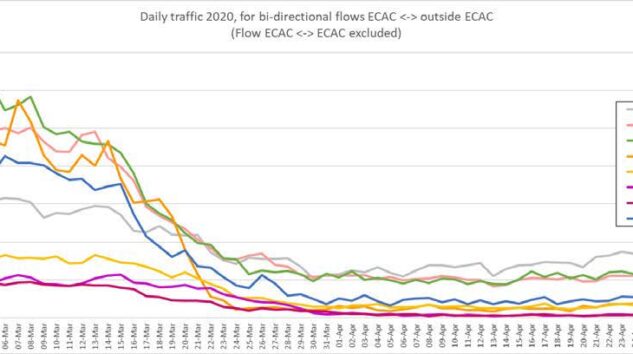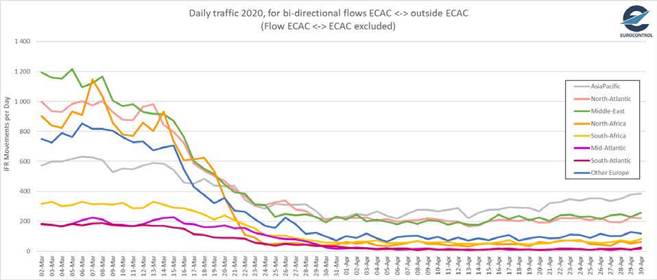 Mart ayının başından bu yana, ECAC ile dünyanın diğer bölgeleri arasındaki tüm çift yönlü trafik akışlarında düşüşler arttı. Nisan 2020’de, ECAC içerideki akışı Nisan 2019’a göre% 89 azaldı. Avrupa’dan Asya / Pasifik’e gelen/ giden akış yüzde 63 oranında azaldı, Orta Doğu’ya gelen / gelen akış ise yüzde 84 düşüş gösterdi.