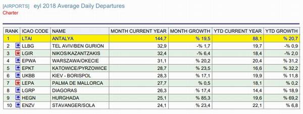 ‪Charter uçuşların eylül şampiyonu yine Antalya Havalimanı oldu. Bu havalimanımız charter uçuşlarda günlük ortalama 144.7 kalkışla ilk sırada yer aldı. Ayrıca bu havalimanımızda charter uçuşlarda eylül sonu itibariyle bir önceki yılın aynı dönemine göre yüzde 20.7 artış gerçekleşti.
