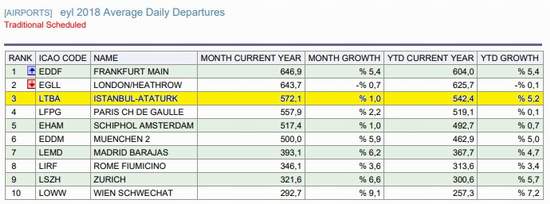 Eylül ayında Eurocontrol İstatistiksel Referans Bölgesi’nde tarifeli uçuşlarda Frankfurt Havalimanı günlük ortalama 646.9 kalkışla ilk sırada yer alırken İstanbul Atatürk Havalimanı günlük ortalama 572.1 kalkışla üçüncü sırada yer aldı.