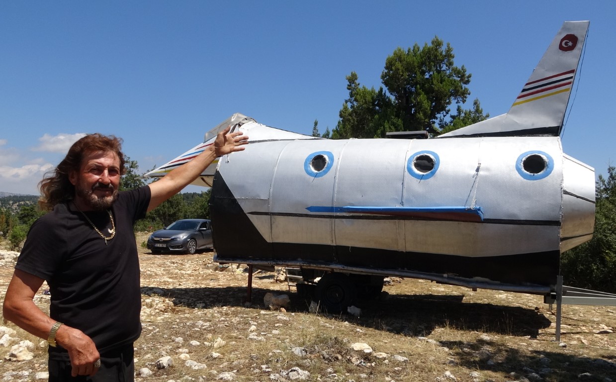 Mersin’in Erdemli ilçesinde bir kişi savaş uçağı F-16’dan esinlenerek yaylada kullanmak için uçak ev yaptı, kendisine 500 bin TL teklif ettiler satmadı. Çiftçilikle uğraşan Mustafa Özer Atmaca, yazın sıcağından kaçmak için yaylada kullanmak amacıyla taşınabilir ev yapmak istedi. Yaklaşık bir ay boyunca araştırma yapan Özer, savaş uçağı F-16’dan esinlendi. İşinden kalan zamanlarda çalışmaya başlayan Atmaca, 6 ay sonunda kokpiti olan uçak görünümlü evini yaptı.