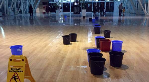 Hatay ve ilçelerinde dün şiddetli yağış etkili olması sebebiyle Hatay Havalimanı’nın çatısı da su akıttı. Havalimanı görevlileri, suyun aktığı yerden kesemeyince altına kova koyarak önlem almaya çalıştı.