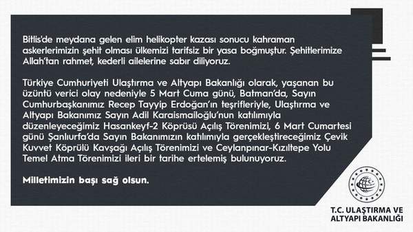 T.C. Ulaştırma ve Altyapı Bakanlığı: ”Allah Şehitlerimize rahmet eylesin, yaralılarımıza acil şifalar versin. Milletimizin başı sağ olsun.”