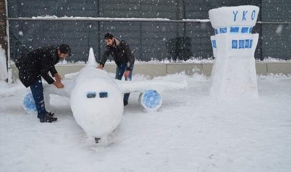 Hakkari’nin Yüksekova ilçesinde üç gündür etkisini sürdüren kar yaşamı olumsuz etkiliyor. Kar yağışını fırsata dönüştüren Selahaddin Eyyubi Havalimanı’nda çalışan iki kişi, kardan yolcu uçağı ve yönlendirme kulesi yaptı.