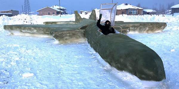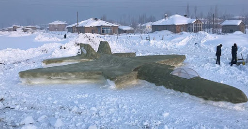 Yeni Mahalle’de yaşayan, inşaat işçiliği ve çobanlık yaparak geçimini sağladığını belirten Mehmet Şerif Karahan, evinin önünde eksi 20 dereceye varan soğuk havaya aldırmadan kardan savaş uçağı yaptı.