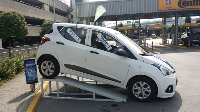 Atatürk Havalimanı otopark girişi yanına konulan otomobil sahibini bekliyor. TASSA üyelerinin araçlarını park ettikleri katlı otopark girişinde özel bir platforma yerleştirilen otomobil adeta buradan her gün kabin memurlarını selamlıyor.