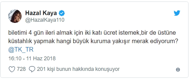 Biletini ileri bir tarihe almak isteyen Hazal Kaya karşılaştığı durumu sosyal medya hesabından şikayet etti. Türk Hava Yolları’nın biletini 4 gün ileri almak için iki katı ücret istediğini iddia eden ünlü oyuncu, bir de üstüne küstahlık yapmak hangi büyük kuruma yakışır merak ediyorum? ifadelerini kullandı.