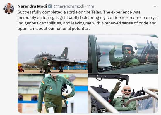 Modi deneme uçuşu ile ilgili “Tejas’la sortiyi başarıyla tamamladık. Bu deneyim inanılmaz derecede zenginleştiriciydi, ülkemizin yerli yeteneklerine olan güvenimi önemli ölçüde artırdı ve ulusal potansiyelimiz konusunda bende yenilenmiş bir gurur ve iyimserlik duygusu bıraktı” dedi.