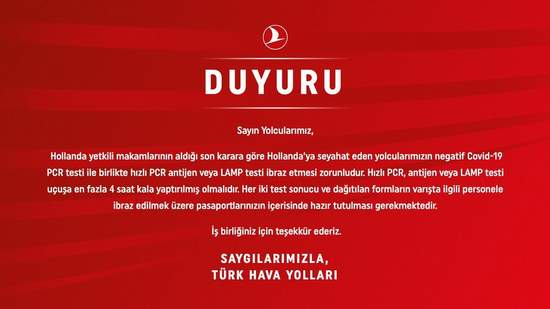 * Hollanda yetkili makamlarının aldığı son karara göre Hollanda’ya seyahat eden yolcularımızın negatif COVID-19 PCR testi ile birlikte hızlı PCR antijen veya LAMP testi ibraz etmesi zorunludur.