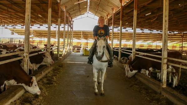 İyi derecede Almanca ve İngilizce bilen Kaplan, hem çalışanlarına “hanım ağa”lık yapıyor hem de büyükbaş hayvanlarının yanında koyun, eşek, tavuk ve köpeklerine bakıyor.