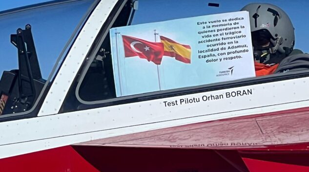 HÜRJET pilotları uçuş sırasında İspanyolca “Bu uçuş, İspanya’nın Adamuz kasabasında meydana gelen trajik tren kazasında hayatını kaybedenlerin anısına, derin bir acı ve saygıyla ithaf edilmiştir.” yazılı dövizler taşıdı.