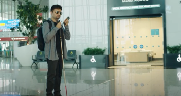 30’lu yaşlarında görme engelli erkek bir yolcu elinde beyaz bastonuyla havalimanına girer. Telefonlarında sesli asistan özelliği kullanan misafirlerimiz, sesli yönlendirmelerle bağımsız bir şekilde istedikleri yere kolayca ulaşabilirler. Bastonuyla kılavuz çizgileri takip ederek danışmanın önüne gelir. Danışmanın önünde üzerinde Braille ve Latin alfabeleriyle kat hizmetleri bilgilerinin yazılı olduğu panoyu okur.