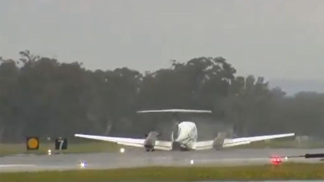 Avustralya’da iniş takımları açılmayan Beechcraft B13 Super King Air tipi uçağın pilotu, gövde üzeri iniş yaptı