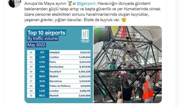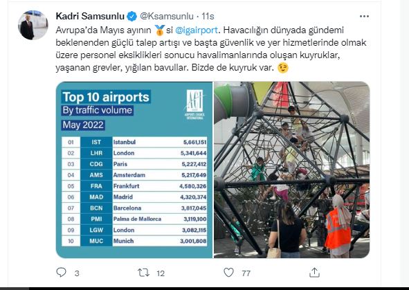 Yaşanan personel eksikliği ve grevler nedeniyle binlerce uçuşun iptal olduğu Avrupa genelindeki havalimanlarında oluşan uzun kuyruklara çocuk oyun alanındaki yoğunluk resmini paylaşarak atıfta bulunarak rakamları paylaşan İGA CEO’su Kadri Samsunlu “Havacılığın dünyada gündemi beklenenden güçlü talep artışı ve başta güvenlik ve yer hizmetlerinde olmak üzere personel eksiklikleri sonucu havalimanlarında oluşan kuyruklar, yaşanan grevler, yığılan bavullar. Bizde de kuyruk var” ifadelerini kullandı
